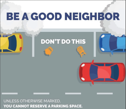 Reserving or “holding” a shoveled parking space with chairs, cones, trash cans, or any other items is not permitted and creates safety and access concerns for others.
