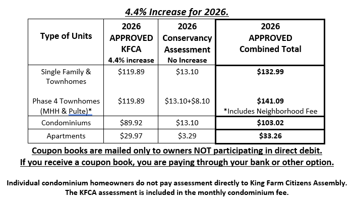 Individual condominium homeowners do not pay assessment directly to King Farm Citizens Assembly. The KFCA assessment is included in the monthly condominium fee.