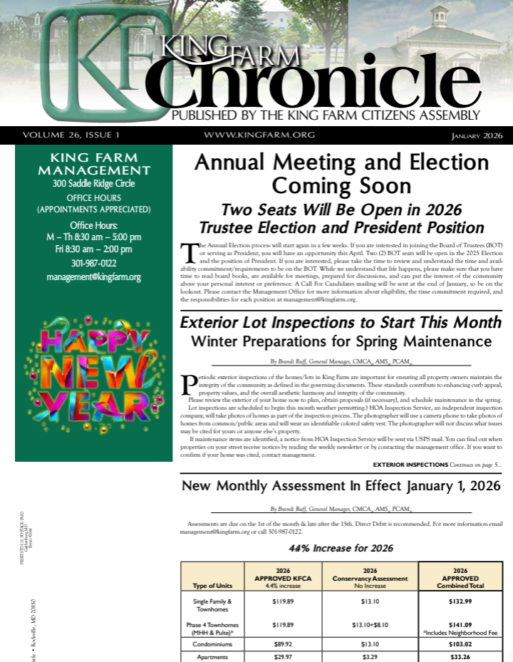 The Chronicle is the Assembly’s principal means of communicating information to the community. The paper is published by the King Farm Citizens Assembly (KFCA), which is responsible for the form, content, and policies of the newspaper.