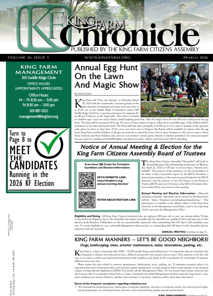 Want to stay in the know about all things King Farm? Head over to the King Farm Chronicle Facebook Page and be sure to sign up for our weekly email newsletters by joining the FrontSteps Resident Portal or by emailing management@kingfarm.org.