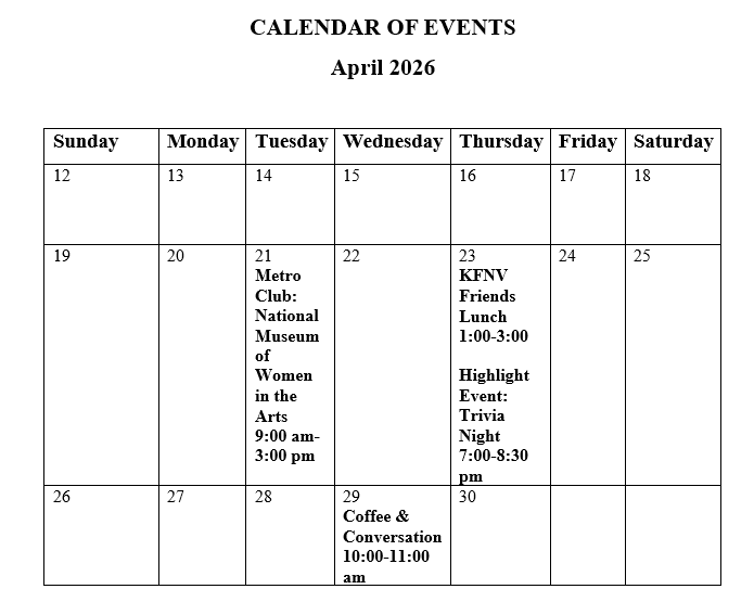 - For its April Highlight Event, the KFNV is hosting its first ever Trivia Night on Thursday, April 23, 2026 from 7:00-8:30 pm in the King Farm Community Center.