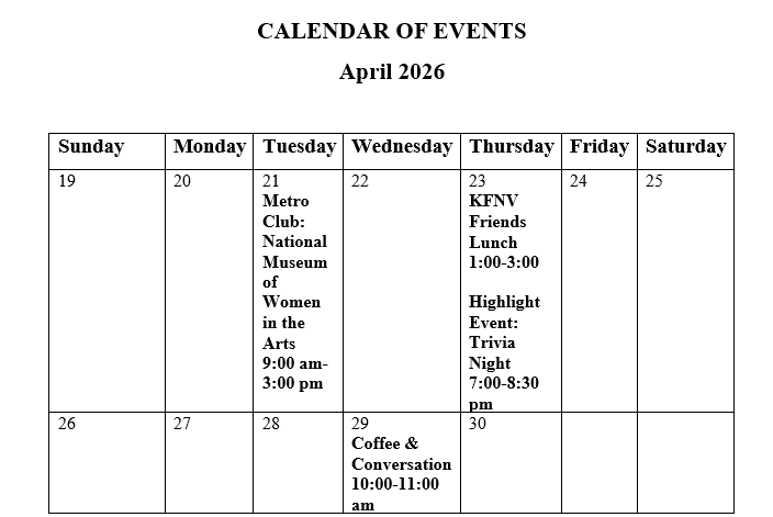 - For its April Highlight Event, the KFNV is hosting its first ever Trivia Night on Thursday, April 23, 2026 from 7:00-8:30 pm in the King Farm Community Center.