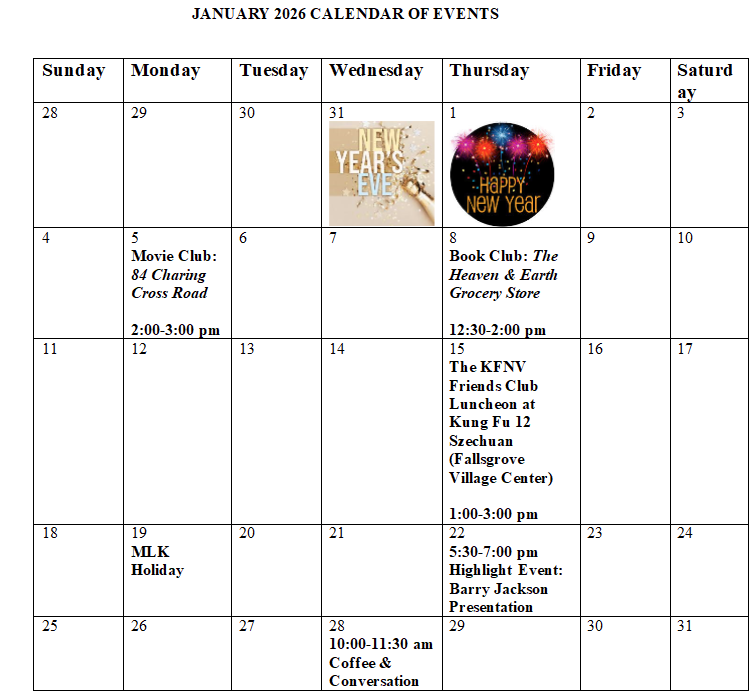 - On Wednesday, January 28, 2026 from 10:00-11:30 pm, the KFNV will host Coffee and Conversation in the Community Center. The topic will be: What is your favorite get away winter location that is not too far from here? Please come and enjoy this first coffee of 2026.