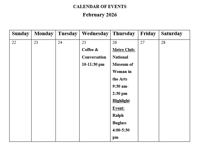• On Thursday, February 26, 2026, the Metro Club will visit the National Museum of Woman in the Arts, 1250 New York Ave NW, Washington, DC 20005. Participants will meet at the Shady Grove Station at 9:30 am and take the Metro into DC. Then they will take a short walk to the museum for a docent-led tour at 11:00 am. After the tour, participants will have lunch at a nearby café. Please note: you must be a member of the KFNV to participate in this event. If you have any specific questions about logistics for this event, please contact the KFNV at (301) 799-8104 and leave a voicemail.