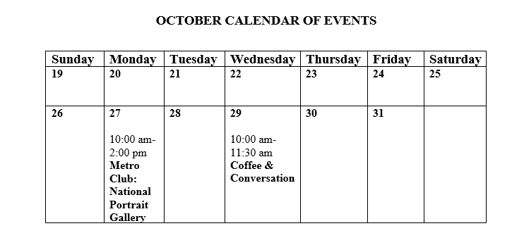 The King Farm Neighbors Village (KFNV) has the following events scheduled for the last two weeks of October.