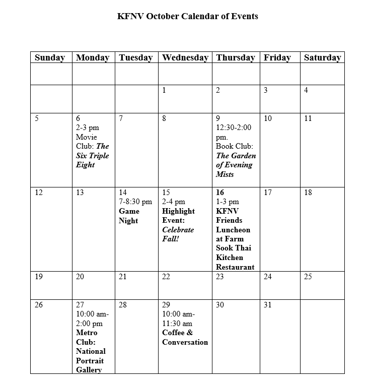 The King Farm Neighbors Village (KFNV) has a full schedule of events and activities for October.