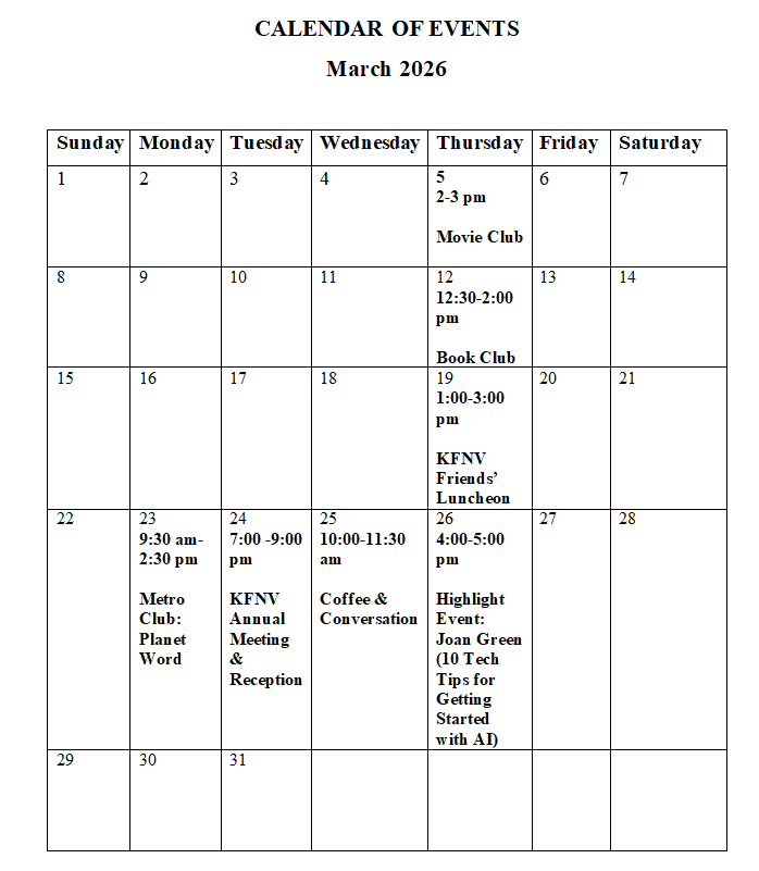 3. The KFNV’s monthly highlight event will be held in the Community Center on Thursday, March 26, 2026 from 4:00-5:00 pm where Joan Green will present: 10 Tech Tips for Getting Started with AI. Ms. Green, a speech language pathologist and a technology specialist will explore: